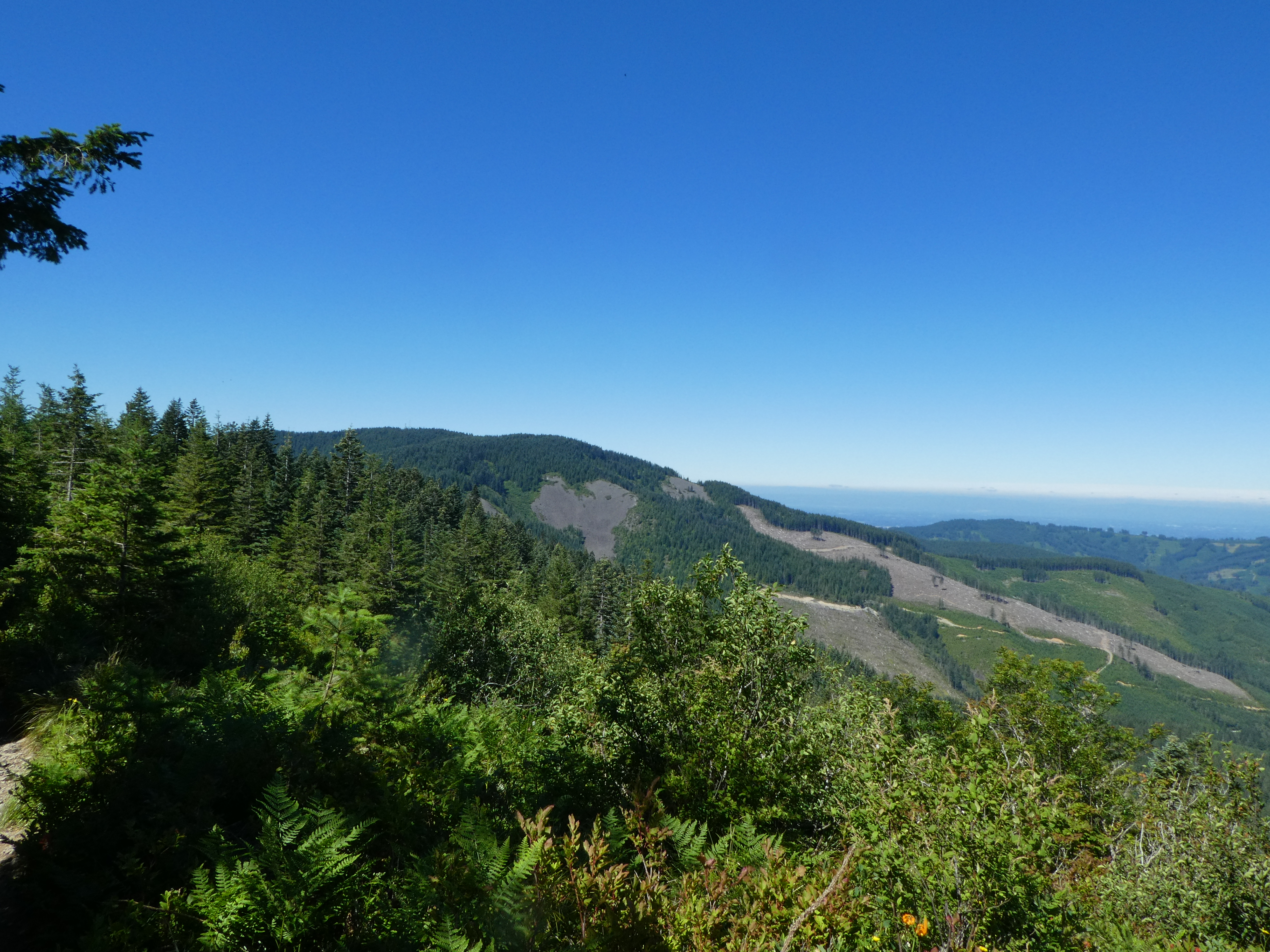 The trail around Pyramid rock is very nice. You get good views of the surrounding clear cut as well as some nice pseudo-level hiking along the scree coming down off of the basalt ledges. Once clear of this rock however, it becomes evident that this was a finger of the mountain we are climbing and now we can put more energy into the actual going up-ness. We have another set of the steep rocky trail. And another. What is up with this thing. My partner later confided to me that she was ready at this point to call it quits and head back to the car, but since I was silently climbing she felt that she had to continue since this hike was, after all, her idea. Why was I silent? No clue.